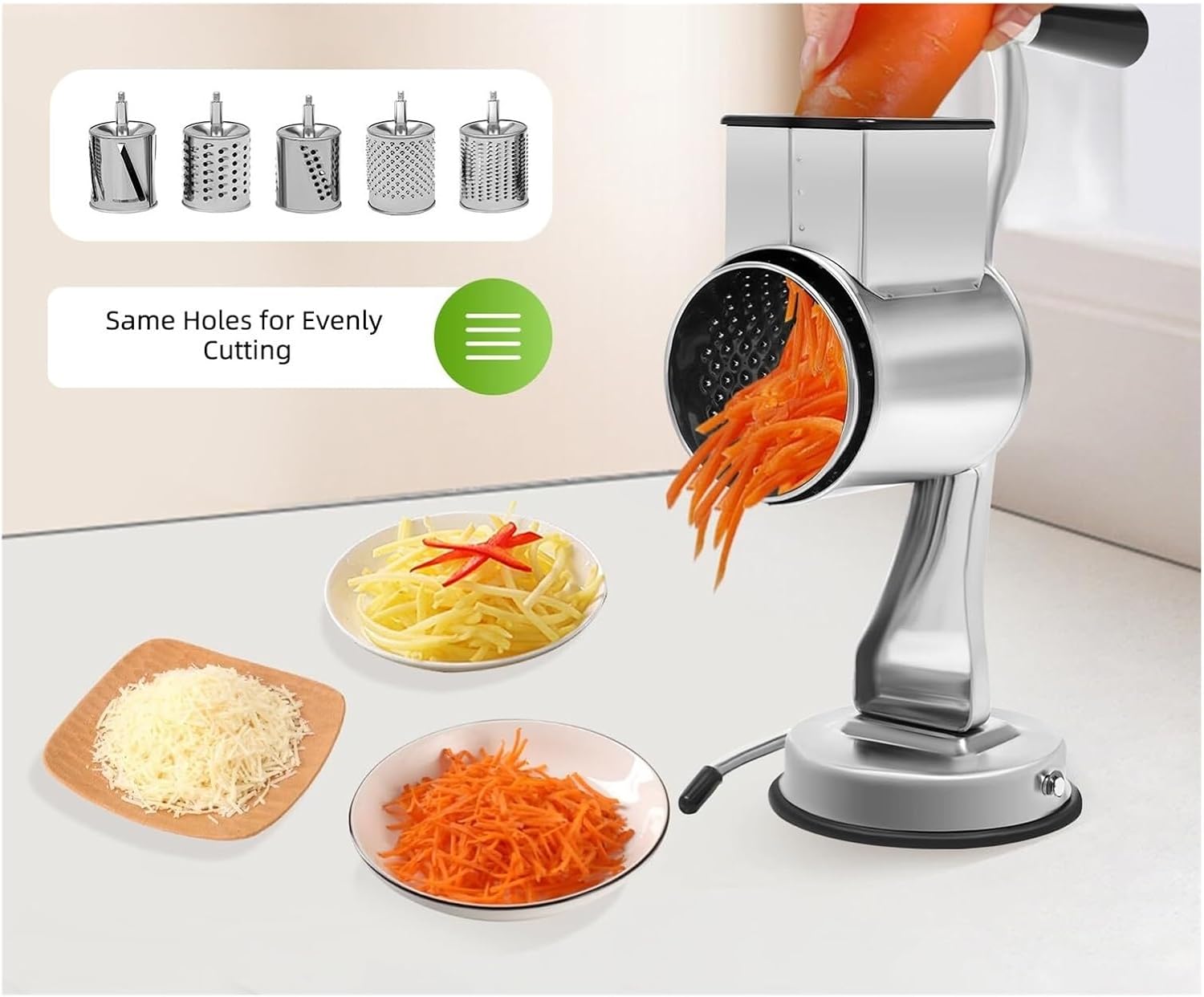 Specifications:Material: 430 Stainless Steel, TPR, ABSColor: SilverOperation Mode: Manual (Hand Crank)Blade Count: 5 (1 pre-installed)Blade Size: 7x8cm / 2.76x3.14inTotal Height: 22.4cm / 8.8inSuction Cup Diameter: 10.1cm / 3.97inDishwasher Safe: YesNet Weight: 0.80kg / 1.76lbsPackage Includes:1x Rotary Grater5x Blades (1 pre-installed)1x Instruction ManualUsage Tips:Always read the manual before first use.Ensure the suction cup is firmly attached to the countertop for stability.Hand wash blades carefully or use dishwasher for easy cleaning.Store in a dry place to maintain longevity.Note:Product does not include food items.Slight color variations may occur due to lighting.Minor size deviations are possible due to manual measurement.This 5-in-1 rotary cheese grater is a must-have kitchen tool for effortless food preparation. Whether grating cheese, shredding vegetables, or chopping nuts, its durable construction and easy-to-clean design make it a practical choice for everyday cooking.