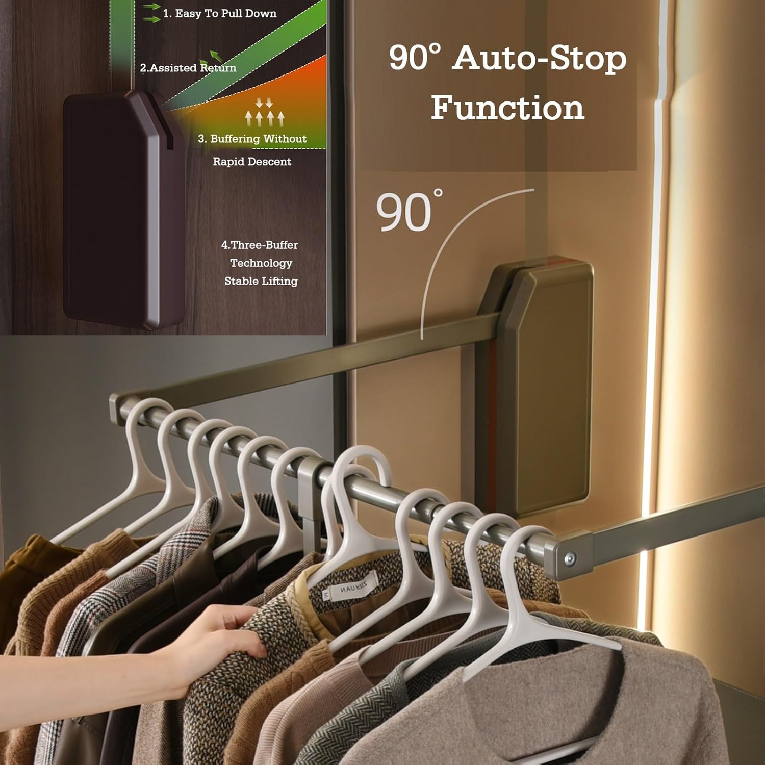 Our pull down closet rod is made of aluminum alloy and ABS, showcasing a lightweight design, easy functionality, features a buffering design,allows you to easily pull down and push up hangers. Strong carrying capacity, makes it never deform even when hanging heavy clothes, This pull down wardrobe rail can be installed on the back or side, suitable for mounting on the wall or inside a wardrobe,Perfect for optimizing space, this rod helps you make the most of every inch of your closet,saving valuable space for your wardrobeSpecifications:Product Name:Pull Down Closet Rod,Adjustable Wardrobe Lift Rail Organizer,Two-way Buffering Heavy Duty Wardrobe Hanger,Retractable Wardrobe Hanger,Wall Mounted Closet Pole,Home Closet Drop Down Hanging RodProduct Material: aluminum alloy and ABSProduct Size:564-664mm/664-864mm/864-1064mmPackage Includes: Pull Down Closet Rod x1