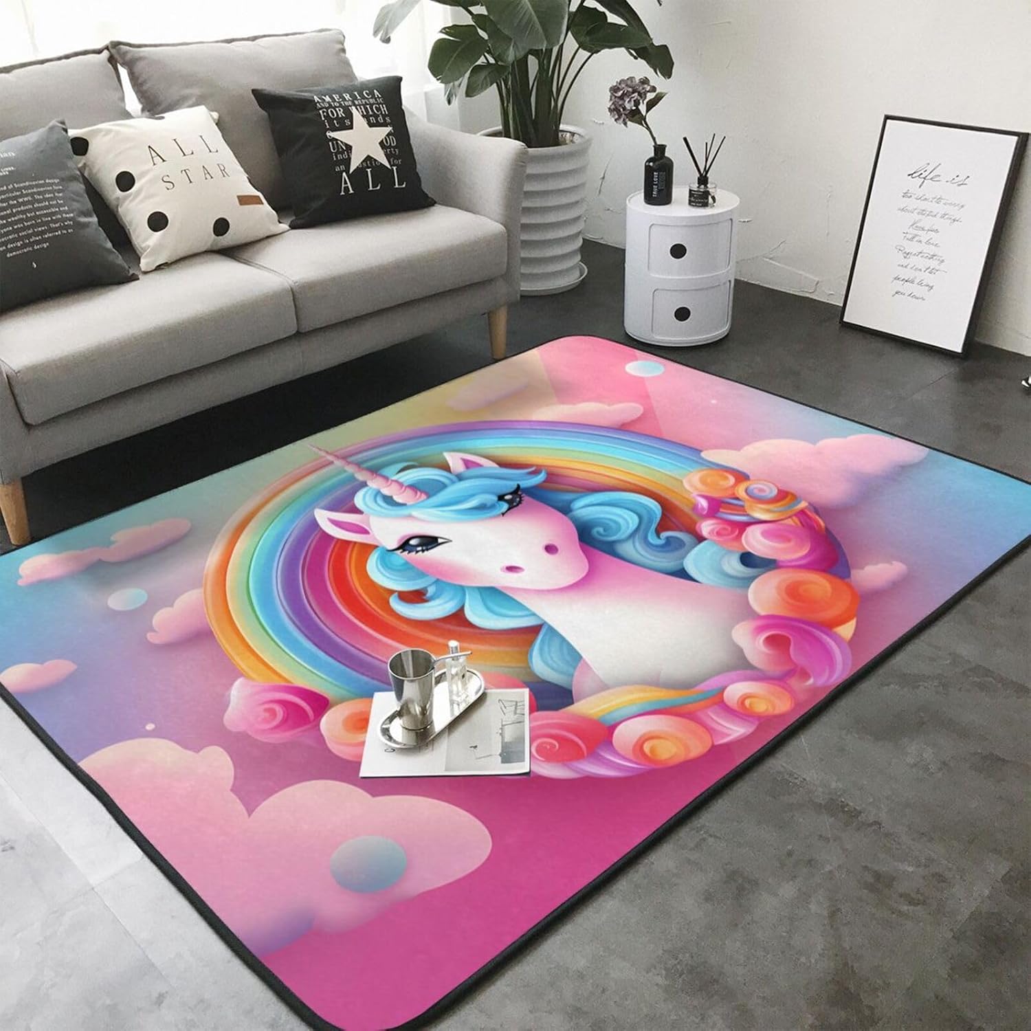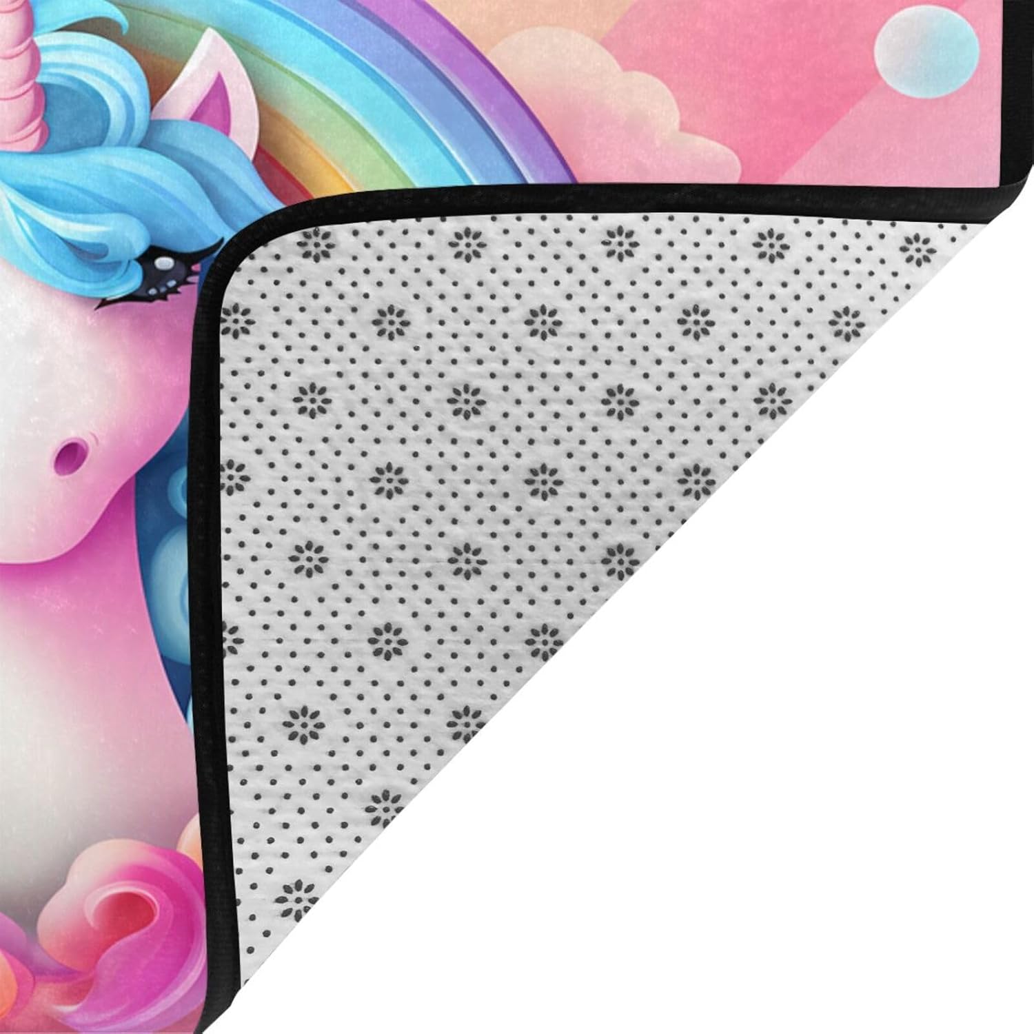 Choose our Rainbow Unicorn printed decorative carpet to bring meticulous care to your family. Made of high-specification polyester flannel, the pile is fine and dense, not easy to pilling and fading, and it will accompany you longer. The memory foam middle layer is like a caring friend, dynamically adjusting the foot pressure, relieving fatigue, and making your every step full of comfort. The non-slip bottom design is like a loyal guardian, silently protecting the safety of you and your family, especially suitable for families with elderly and children. Easy to clean, can be washed by water or machine, saving time and effort. Exquisite cutting and sewing technology ensures that the edge of the carpet is flat and burr-free, and the truth is in the details. Whether it is a bathroom, bedroom or office, it can add a touch of warmth and peace of mind to your life.
