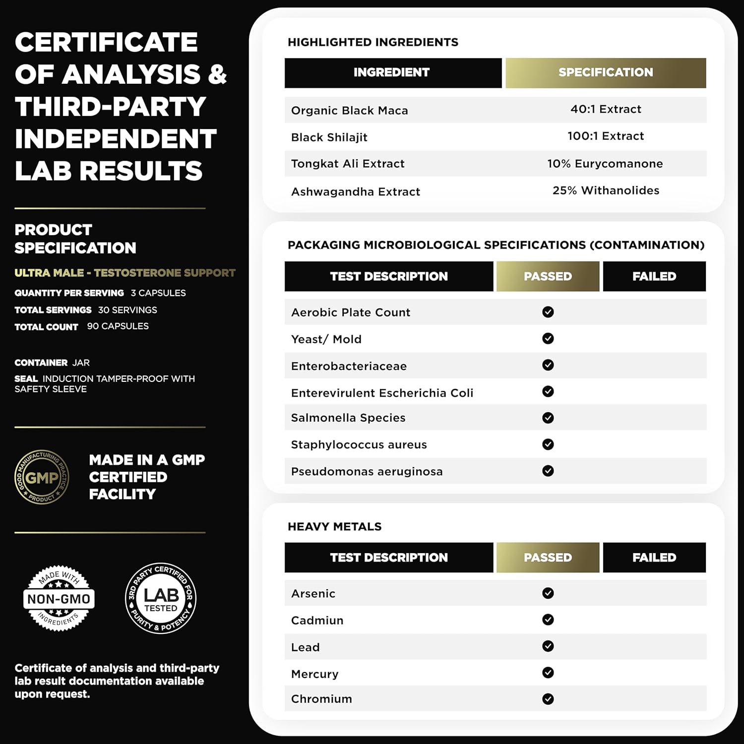 | Special Ingredients | 100:1 Black Shilajit, 100:1 Irish Sea Moss, 40:1 Organic Black Maca Root Extract, Ashwagandha standardized to 25% Withanolides, Tongkat Ali standardized to 10% Eurycomanone |