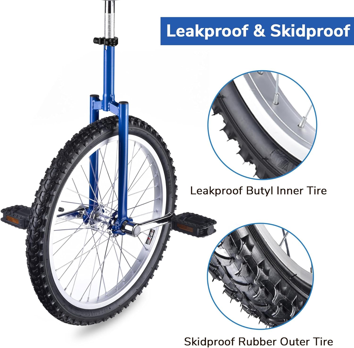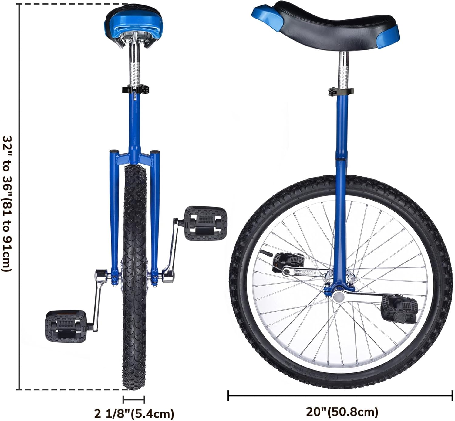 Features:- Solid Construction - 20" Outdoor Unicycle Wheel, measuring 20" x 15 3/16" x 35 13/16" in size, is constructed of a strong manganese steel frame and thick aluminum alloy rim for strong support and enhanced durability, along with 36 steel spokes for exceptional stability, ideal for kids and adults to practice riding and improve balance- Adjustable Seat - Includes an adjustable seat with a clamp on the seat post for height adjustment, ranging from 32" to 36", applicable for user heights of 57" to 69", catering to both kids and adults. Comes with a rear handle on the seat for grabbing onto, along with padded saddle for enhance safety and comfort- Leakproof & Skidproof - Features leakproof butyl inner tire which can be used up to 100 days after inflated, along with rubber outer tire and pedals with skid-proof embossed pattern for added stability and safe ride- Easy Installation - Comes with a complete set of tools and accessories including quick release seat post clamp, wrench and screws, allowing for a simple and quick installation process which is user-friendly- Wide Application - Features mute bearing for noiseless riding, suitable for students, office workers, beginners, riding amateurs to use for daily fitness exercise, riding practice, balance training, talent show, hobby, etc.Specifications:- Overall Dimension(LxWxH) 20" x 15 3/16" x 35 13/16" (50.8 x 38.5 x 91 cm)- Tire Dimension(DiaxH) 20" x 2 1/8"- Seat to Pedal Distance 15" to 32"- Adjustable Unicycle Height 32" to 36"- Suitable User Height 57" to 69"- Steel Spoke Quantity 36- Weight Limit 143 Lbs- Net Weight 9.5 Lbs (4.3 kg)Package Contents:- 1x Unicycle Frame- 1x Unicycle Saddle- 1x Wheel- 2x Pedals- 1x Wrench- 1x Manual- Package Content: