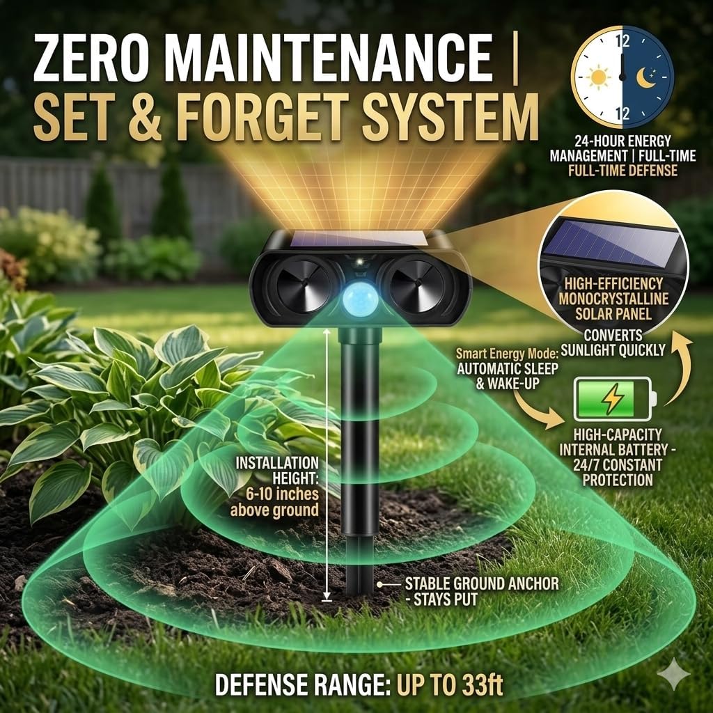 Customer Q&AQ1: How does this 2026 ultrasonic cat repellent work to keep animals away?A1: It uses state-of-the-art ultrasonic technology to emit powerful ultrasonic waves, accompanied by an alarm sound. This combination effectively scares animals away from your property without harming them.Q2: What animals can this repellent deter?A2: It is designed to drive away squirrels, raccoons, rabbits, cats, dogs, skunks, foxes, and other common pests, protecting your plants, gardens, and outdoor spaces.Q3: Does the motion sensor work at night or in low light?A3: Yes, the built-in motion detection sensor is highly sensitive and works day or night. It triggers within a 110-degree angle and a range of 25–33 feet upon detecting movement.Q4: How is the device powered, and is it energy-efficient?A4: It features a high-efficiency solar panel for fast charging in sunlight. When no motion is detected, it automatically returns to standby mode to conserve energy.Q5: Is this repellent waterproof and suitable for outdoor use in all weather?A5: Yes, with an IP44 waterproof rating, it can withstand rain, snow, and freezing conditions, making it reliable for gardens, farms, ponds, camping, and more.Q6: Can I use it indoors, like in garages or attics?A6: Absolutely. It’s versatile for both indoor and outdoor use, including yards, patios, garages, attics, porches, boats, and campsites.Q7: Is the repellent safe for pets and humans?A7: Yes, it is completely safe. It only uses ultrasonic waves and sound to deter animals—no traps, chemicals, or harm to humans or pets.Q8: How do I install and set up the device?A8: Simply insert it into the ground or hang it in a sunny location, then switch it on. Its compact design makes it easy to place or carry for outdoor activities.Q9: Does it work on all types of animals, including larger ones?A9: It is most effective on small to medium-sized animals like rodents, raccoons, and cats. Results may vary with larger or less sensitive animals.Q10: What happens during cloudy days or limited sunlight?A10: The solar panel stores energy, so it remains operational during short periods of low light. For optimal performance, place it in an area with plenty of sunlight. keep stray cats away keep cats out of yard permanently ultrasonic pet deterrent for stray cats cats repellent cat away repellent outdoor repelente para gatos espanta gatos exterior cat deterrent motion activated solar cat repellent ultrasonic outdoor stray cat repellent outdoor keep cat from running out door cat tie repellent cat scarer outdoor cat deterrent with sound cat sensor to keep away cat flashing red deterrent light to scare cats cat repellent outdoor ultrasonic cat repellent for outdoors