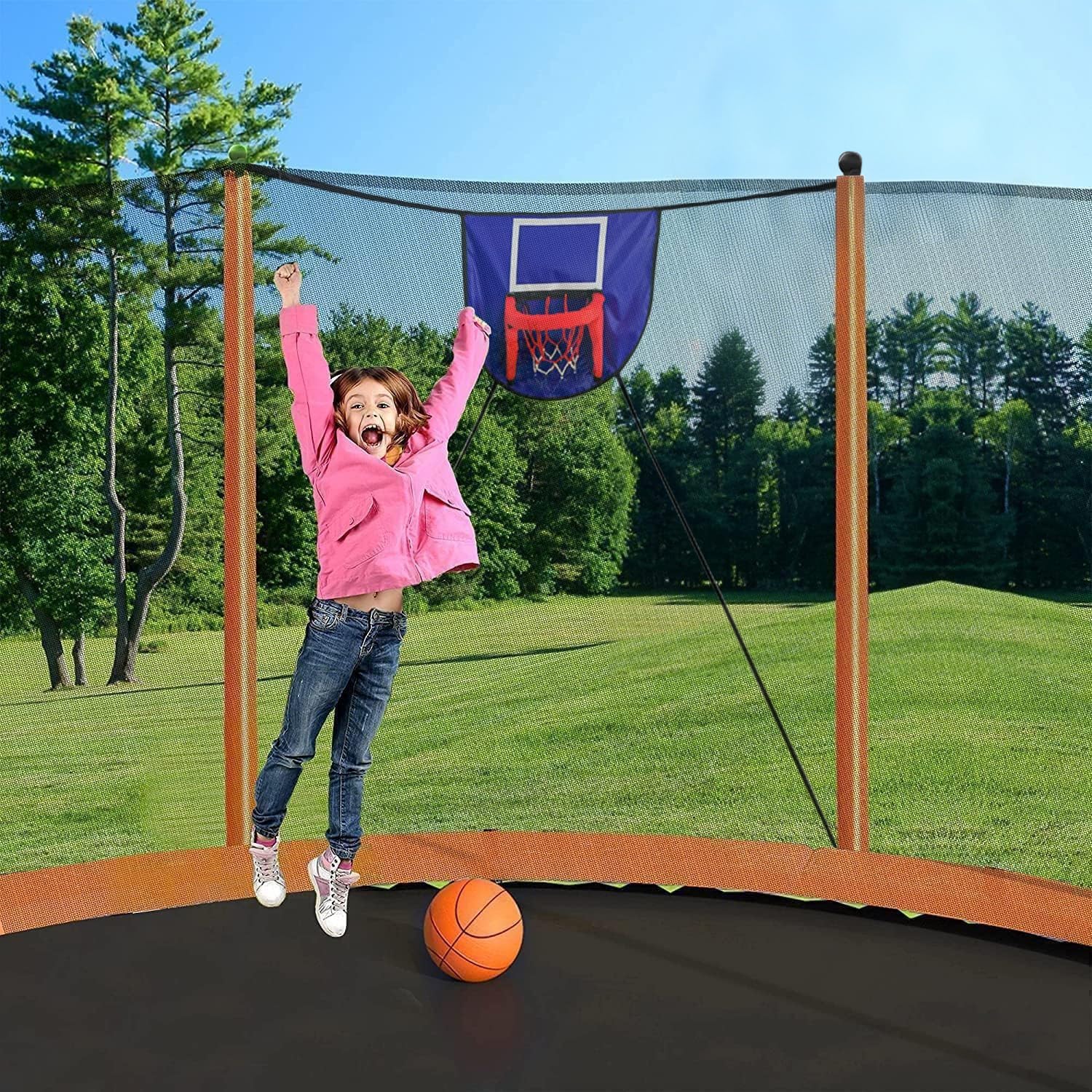 Jump for Fun and Exercise Jumping is a great way burn calories while having loads of fun. It can improve your kid's strength, bone density, agility, balance and coordination. With the large trampoline, your kids can also stay away from electronics.Sturdy Trampoline for Kids and Adults The frame uses reinforced steel with a T joint assembly, making the big trampoline a solid, rigid base and a smoother, more impressive bounce and a heavy duty load for kids and adults. The rust-resistant frame offers long-term use. The net is strong and of good quality. Indoor and Outdoor Use In addition to outdoor, this big trampoline for kids can also be used indoors, even if it is raining, your kids can also have fun indoors. The recreational basketball hoop add tons of fun for your kids. Specifications16 FT Trampoline Max Load Weight: 1500 lbs, for 8-10 kids, (SINGLE person limit: 264 lbs)15 FT Trampoline Max Load Weight: 1400 lbs, for 7-9 kids, (SINGLE person limit: 264 lbs)14 FT Trampoline Max Load Weight: 1200 lbs, for 6-8 kids, (SINGLE person limit: 264 lbs)12 FT Trampoline Max Load Weight: 1000 lbs, for 5-7 kids, (SINGLE person limit: 264 lbs)10 FT Trampoline Max Load Weight: 600 lbs, for 3-5 kids, (SINGLE person limit: 264 lbs)Trampoline Height: 8.86 FTEnclosure Net Height: 5.9 FTLeg Height: 2.95FTFrame Construction and Springs: Rust-resistant Galvanized Steel Jump Mat and Spring Pad: UV ResistantCertification: ASTM F381 & F2225 Approved Easy Assembly Needed: YesPackage Information16FT / 15ft / 14ft Trampoline will come into 2 package boxes.12FT / 10ft Trampoline will come into 1 package box.